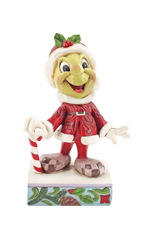 „Be Wise and Be Merry“ This year, Jiminy Cricket lets Christmas be his guide. Donning Santa’s coat and boots the charming little insect hopes to turn all your wishes true this season. Walking with a candy cane, the cricket smiles brightly in this Jim Shore classic. Hand painted and hand crafted from high quality cast stone.