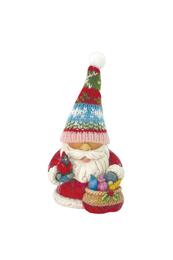 This festive Jim Shore gnome dons a knit holiday hat patterned with snowflakes and Christmas colours, bringing a cozy, inviting texture. Carrying a bag full of ornaments and gently holding a cardinal, he brings holiday cheer to your home.