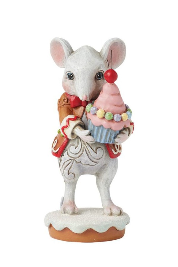 This charming Gingerbread Christmas mouse by Jim Shore offers you a delightful cupcake topped with a bright red cherry. Dressed in a festive gingerbread coat adorned with icing details, his sweet smile and cheerful spirit, brings a touch of whimsy to you
