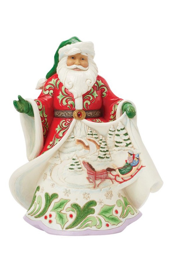 This Jim Shore First Edition Santa showcases the artist’s signature rosemaling on a beautifully detailed coat that opens to reveal a cozy winter scene of a horse-drawn sleigh gliding through the snow while playing Over the River. Each piece is signed by Jim Shore on a special understamp and numbered 1-1000 worldwide.