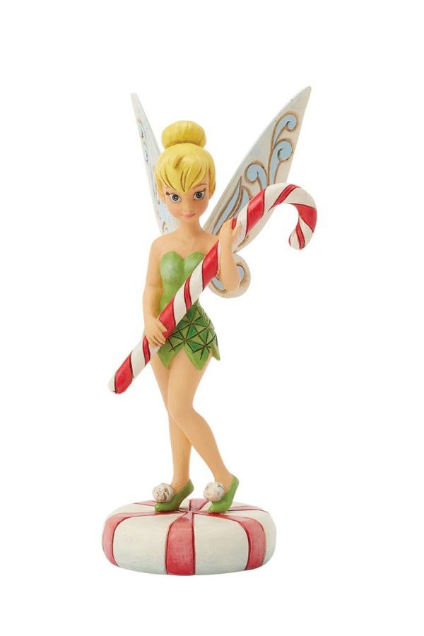 In this enchanting Jim Shore design, Tinker Bell stands atop a vibrant peppermint, delicately holding a candy cane with a sweet smile that radiates holiday warmth. Her enchanting presence brings a touch of pixie dust and magic to the holiday season.