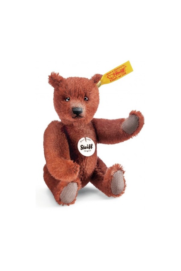 Es handelt sich um einen traditionell gelenkigen Teddybären mit handgenähter Nase und Mund. Er ist oberflächenwaschbar, mit Sicherheitsaugen versehen und trägt den berühmten Steiff-Messingknopf im Ohr sowie ein gelbes Etikett.