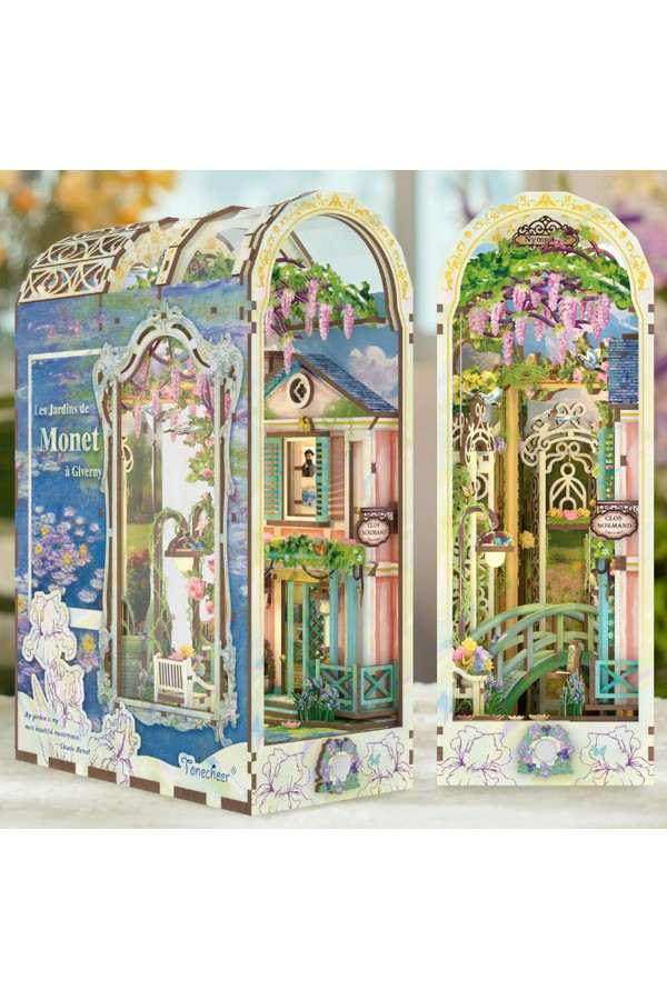 In dit miniatuurlandschap doemen stille reflecties op van een tuin waar Claude Monet zich ooit liet inspireren. Het gedempte licht streelt de bloesems en wekt het gevoel op dat de tijd even stilstaat en je de rust kunt ademen. Deze scène, perfect ingebed tussen twee boeken, fluistert zachtjes: hier bevindt zich een geheime ontsnapping, een kunstwerk om te koesteren.