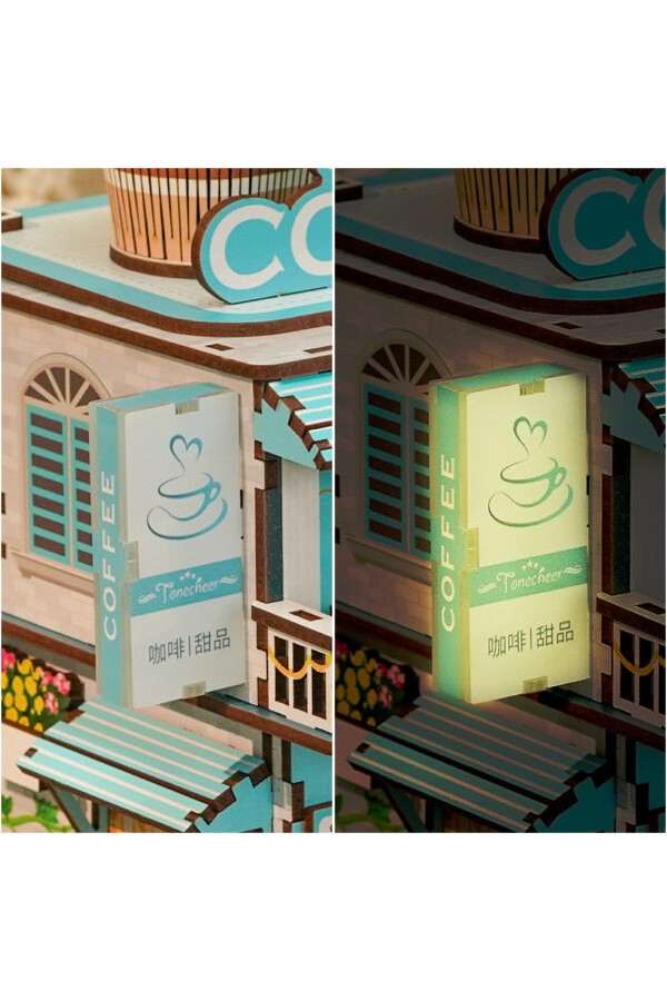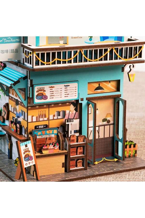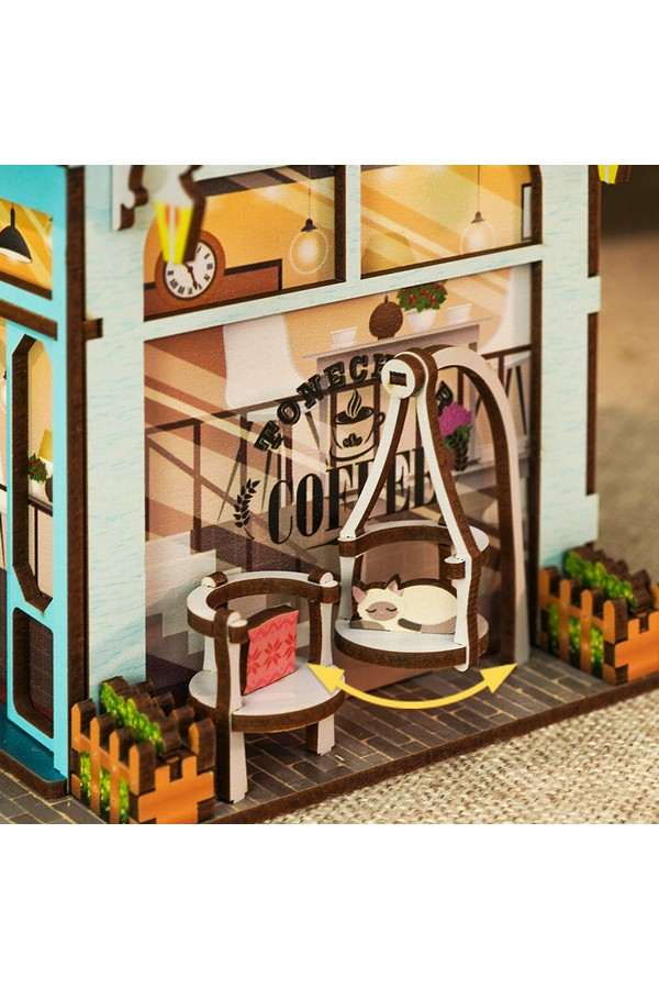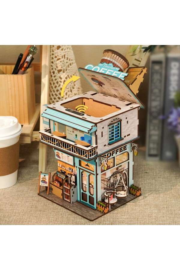 Dit koffie huis vol prachtige details kan alleen maar motiverend werken om aan je bureau te gaan zitten. De verbluffende details en mechanisme met sensor zorgen ervoor dat dit een praktisch pronkstuk is op je bureau. Dit kleurrijke koffie huisje staat vol met taartjes op de toonbank, alle koffiesoorten om mee te nemen en de barista’s staan klaar om je verder te helpen. Deuren en luiken kunnen open en dicht en de hangstoel met liggende kat kan bewegen. Het koffie huisje heeft ook een verdieping met een balkon. Boven het huisje staat het naambord met een grote take away koffie beker en papieren zakje gevuld met lekkers. Dit vouwt d.m.v. een bewegingssensor open om de rommel in weg te kunnen gooien.