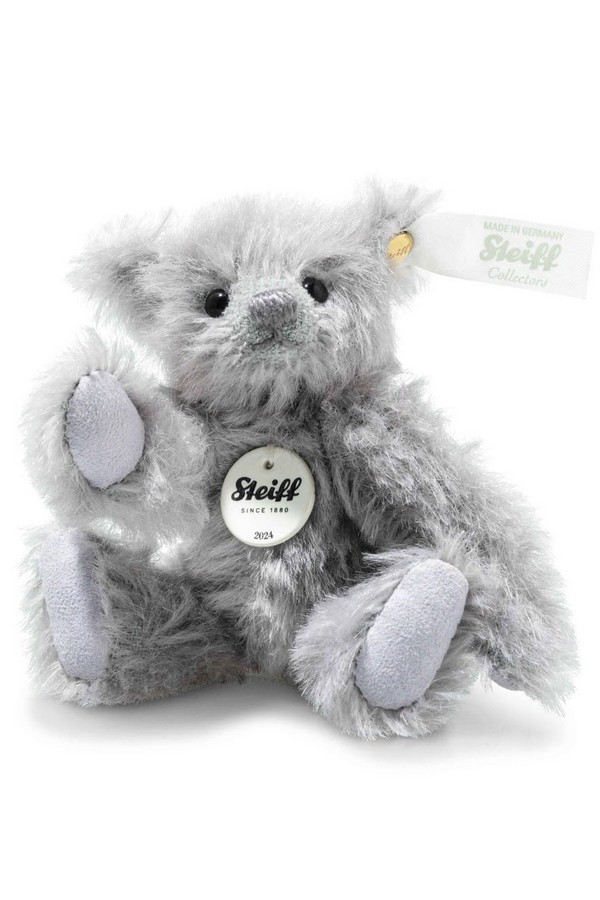Hij is gemaakt uit grijs mohair, heeft veiligheidsogen, fiberfill vulling, een geborduurde neus en is volledig 5-voudig geschijfd. Hij komt in een doosje. Hij heeft zijn “Knopf im Ohr”.